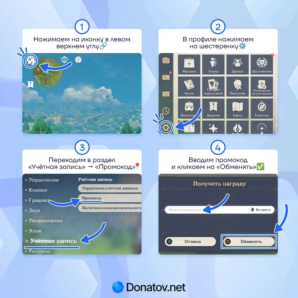 - Активируйте код на официальном сайте Genshin Impact или внутри игры