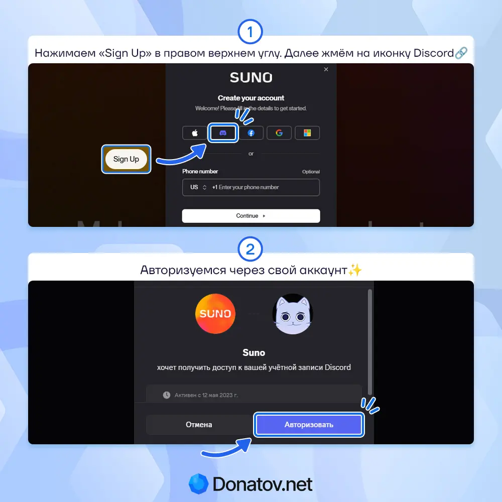 - Для начала зарегистрируйте аккаунт в Suno AI (на официальном сайте или в приложении), используя Дискорд в качестве способа входа